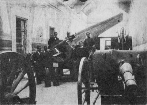 Hemerografía. Retrato de grupo de los generales Antonio Flores y Paz, teniente coronel Francisco Rocha, capitán de fragata Agustín Zenferes, mayor Salvador Herrera y Caro, Teniente Ignacio Flores y general Manuel Mondragón Este último construyó un poderoso cañón de 12 metros de largo para el artillamiento de Salina Cruz. En esta fotografía el cañón es cerrado, listo para ser instalado en tal puerto. Contiene dibujo sobrepuesto a lápiz del cañón.