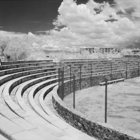 Fotografía. Vista de las gradas de un estadio [posiblemente el de Prácticas], desde las mismas gradas se observa a lo lejos arboles y la construcción de un edificio aún sin terminar.
