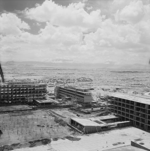 Fotografía. Se aprecia la construcción de los edificios de la Facultad de Arquitectura y la Facultad de Ingeniería, en segundo plano se aprecia un paisaje con montañas