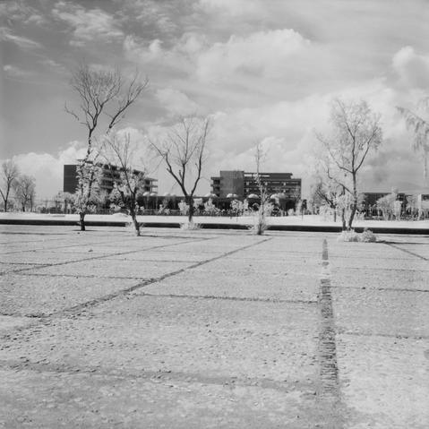 Fotografía. Toma desde la explanada de la Facultad de Derecho, se puede ver La Torre de Rectoría y el Posgrado de Arquitectura