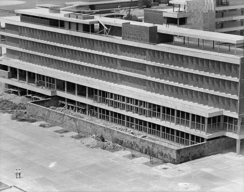 Fotografía. Edificio de la Facultad de Ingeniería en construcción, se observan dos personas caminando.