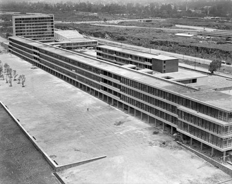 Fotografía. Explanada y aún en construcción las facultades de Economía, Derecho y Filosofía y Letras, y la Torre I de Humanidades. Se observa al fondo vegetación frente a estas facultades del lado del Circuito Escolar y del lado de la avenida de los Insurgentes.