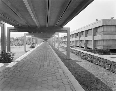 Fotografía. Vista de un pasillo rodeado por pasto y vista lateral de un edificio.