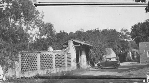 Fotografía de una vista general de la casa que habitó Maximiliano de Habsburgo en Acapatzingo, cerca de la ciudad de Cuernavaca. Incluye inscripciones y mecanuscrito en la parte posterior. Autor: Rafael Sánchez Escobar.