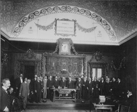 Fotografía. Ceremonia en el Paraninfo de la Escuela Nacional Preparatoria.Presidida por el rector Joaquín Eguía Lis. Inscripción en el soporte “El Consejo Universitario la noche del 22 de septiembre de 1913. De izquierda a derecha: Prof. Acosta e ilegible. Consejeros Carlos Ituarte. Oficial Pedro Henriquez Ureña. Consejero Miguel Martínez y Guillermo Schmall. Secretario Francisco Pascual García. Consejeros Alfredo Ramos Martínez, Alfonso Pruneda, Leopoldo Kiel y Ezequiel A. Chávez. Ex Ministro de Instrucción Pública Manuel Gurza Aldape, Rector Joaquín Eguia Lis, subsecretario de Instrucción Pública Nemesio García Naranjo, Consejeros Miguel Avalos, Víctor Rubio Alpuche, Domingo Orvañanos, José Ma. Ilegible, Diego Baz, Manuel ilegible, Victoriano Pimentel, Alberto Pani”.